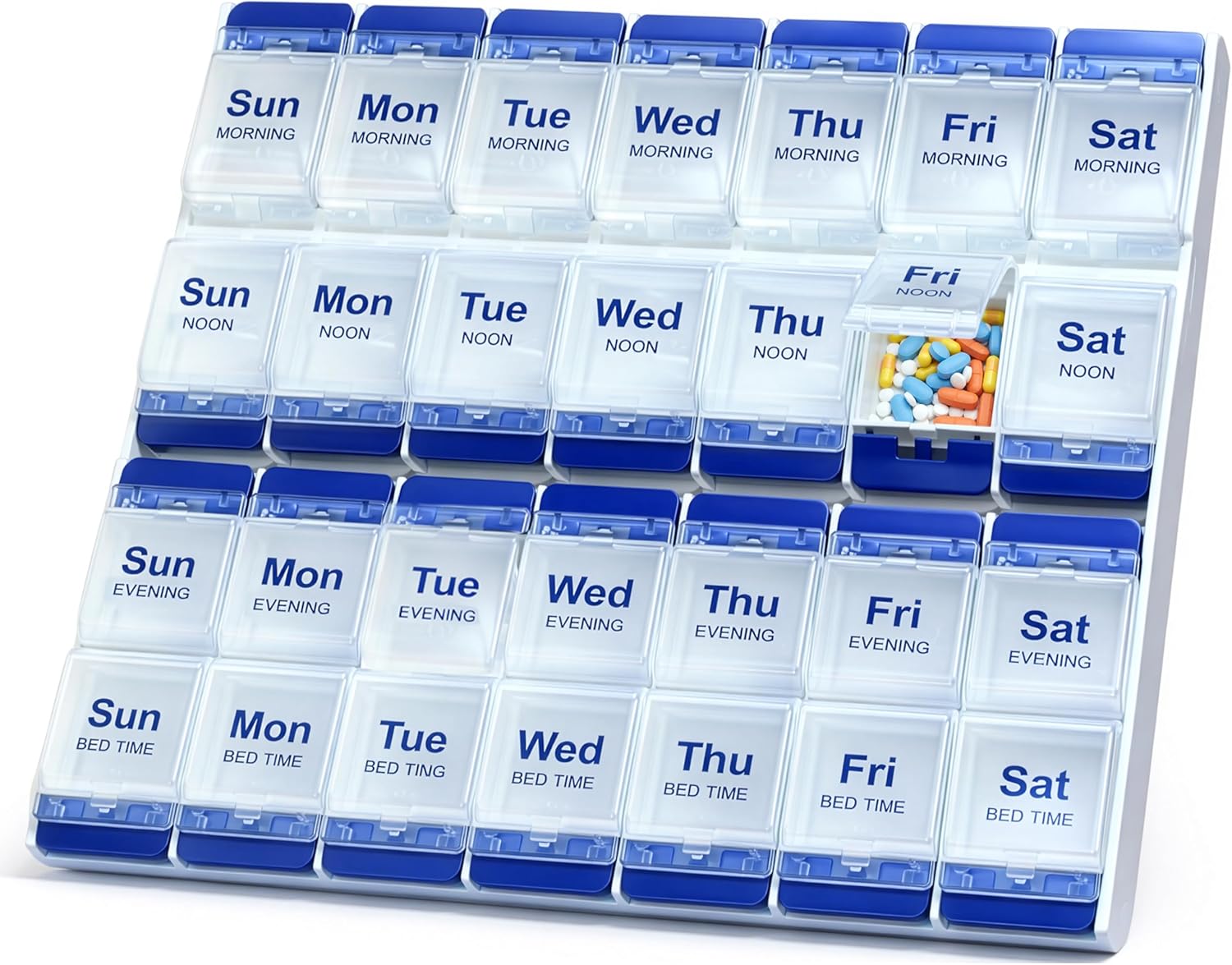 - Large Capacity Compartments: Holds tablets, capsules, fish oil, and other supplements.